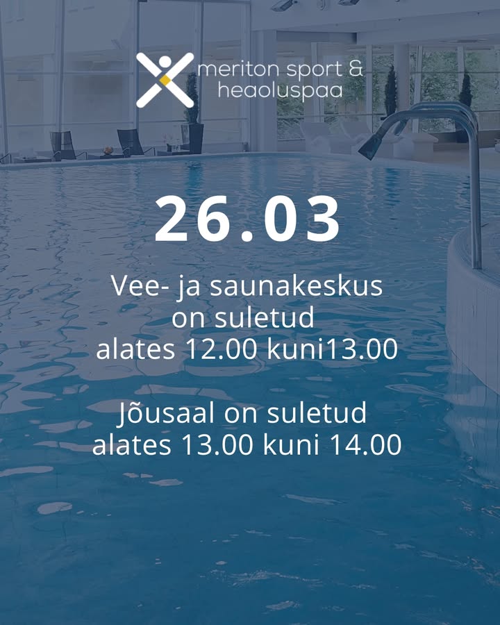 Hea külastaja! 💙 Palume pöörata tähelepanu, et 26.03 ⬇️ 💦 Vee- ja saunakeskus on suletud kell 12.00–13.00 🏋️ Jõusaal on suletud kell 13.00–14.00 Ülejäänud ajal oleme avatud tavapäraselt ning ootame teid külla! Täname mõistva suhtumise eest 🙏